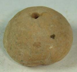 | Description / विवरण | Perforated terracotta bead, betel nut in shape, broken base and having circular depression at base. |