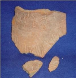 | Description / विवरण | Potsherd - part of neck of pottery, with designs of incised lines. 4 letters of Brahmi script is inscribed on top. It is broken into 3 parts. The back surface is rough with orange colour. |