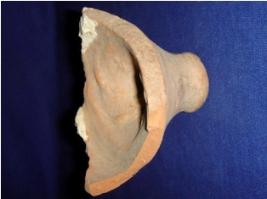 | Description / विवरण | Terracotta potsherd, probably part of base of a container. The base is flat and cylindrical, and above it broken portion of pottery is present. |
