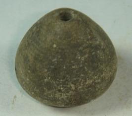 | Description / विवरण | Perforated terracotta bead, betel nut body with slight depression at the base. |