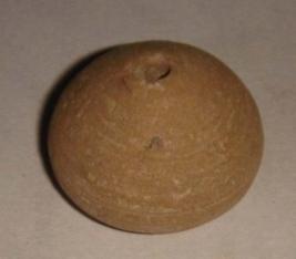 | Description / विवरण | Perforated terracotta bead, betel nut in shape, slight depression on the base. |