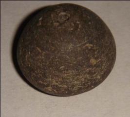| Description / विवरण | Plain, perforated terracotta bead, betel nut in shape, having concentric circles at the base. |