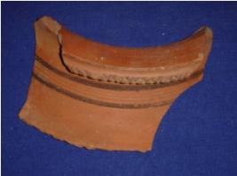 | Description / विवरण | Potsherd of Kushana period, having out turned rim with serpentine designed edges. Two black coloured parallel painted lines are seen on the neck in between which three carinated marks are seen. The rim is partially broken. |