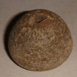 | Description / विवरण | Perforated terracotta bead, betel nut in shape and pits at the body. |