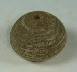 | Description / विवरण | Perforated terracotta bead, betel nut in shape, slightly flaking at the side. |