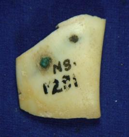 | Description / विवरण | Fragment of a broad ivory bangle with smooth surfaces and without any decoration. Two pins are visible inserted on it |