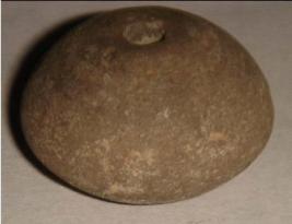 | Description / विवरण | Plain, perforated terracotta bead, betel nut in shape with broad flat end. |