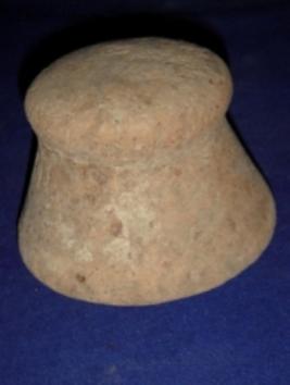 | Description / विवरण | Stone potter s tool, with flat circular base, narrow tapering body towards upper end. The grip at top is oval and circular. |
