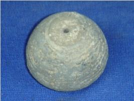| Description / विवरण | Terracotta bead having betel nut body and flat base with slight depression. It has a perforated hole in the centre and concentric circles on the body. |