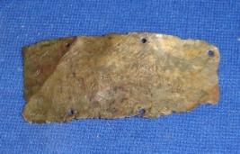 | Description / विवरण | Thin Fragment of Copper piece, rectangular in shape, having five perforated holes on the surface, probably to fix this piece to other object. |