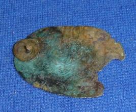 | Description / विवरण | Thin Fragment of Copper piece, oval in shape, slightly broken from one edge, having perforated hole with small pin, probably to fix this piece to other object. |
