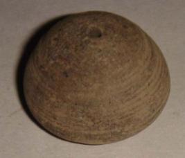 | Description / विवरण | Perforated terracotta bead, betel nut in shape, slight depression at the base with striation marks on both body and base. |