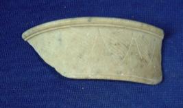 | Description / विवरण | Fragment of broad ivory bangle, with incised floral design. One edge is thick and flayered out. |