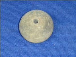 | Description / विवरण | Small terracotta bead with betel nut body and flat base. It has perforated hole in centre and surrounded with striation marks. |