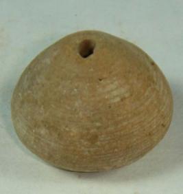 | Description / विवरण | Perforated terracotta bead, ill fired, betel nut in shape having striation marks at body and base. |