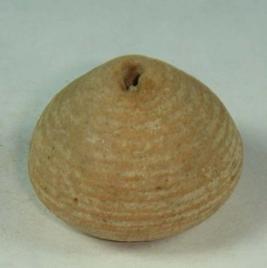 | Description / विवरण | Perforated terracotta bead betel nut in shape, having striation marks at body and base. |
