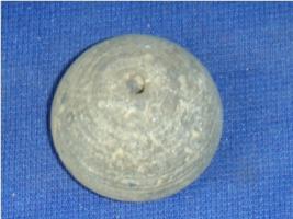 | Description / विवरण | Small terracotta bead with betel nut body and flat base. It has perforated hole in centre and surrounded with striation marks. |