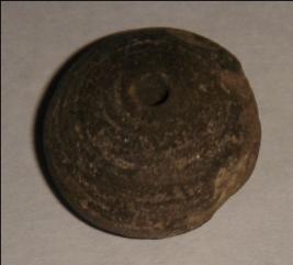| Description / विवरण | Small terracotta bead with betel nut body and flat base. It has perforated hole in centre and surrounded with striation marks. Its body is chipped off at edges. |