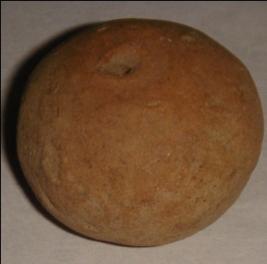 | Description / विवरण | Plain, spherical terracotta bead with a perforated hole in the centre. It is coarse with cut marks at one side. |