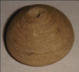 | Description / विवरण | Small terracotta bead with betel nut body and flat base. It has perforated hole in centre and surrounded with striation marks. |