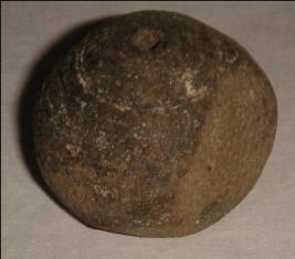 | Description / विवरण | Small terracotta bead with betel nut body and flat base. It has perforated hole in centre and surrounded with striation marks. The body is half chipped off. |