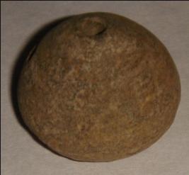 | Description / विवरण | Small terracotta bead with betel nut body and flat base. It has perforated hole in centre and surrounded with striation marks. The lower part of body is partly flaked off with some holes. |