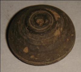| Description / विवरण | Small terracotta bead with betel nut body and flat base. It has perforated hole in centre and surrounded with striation marks. It is semi fine and has a depression at base. |