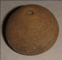 | Description / विवरण | Small terracotta bead with betel nut body and flat base. It has perforated hole in centre and surrounded with striation marks. It is semi fine and has a depression at base. |