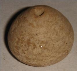 | Description / विवरण | Small terracotta bead with betel nut body and flat base. It has perforated hole in centre and surrounded with striation marks. It is semi fine and has a depression at base. |
