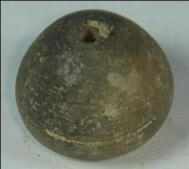 | Description / विवरण | Small terracotta bead with betel nut body and flat base. It has perforated hole in centre and surrounded with striation marks. It is semi fine and has a depression at base. |
