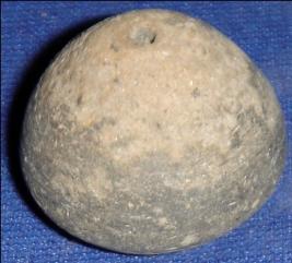 | Description / विवरण | Small terracotta bead with betel nut body and flat base. It has perforated hole in centre and surrounded with striation marks. It is semi fine and has a depression at base. |