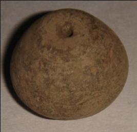 | Description / विवरण | Small terracotta bead with betel nut body and flat base. It has perforated hole in centre and surrounded with striation marks. It is semi fine and has a depression at base. |