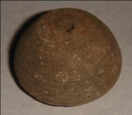 | Description / विवरण | Small terracotta bead with betel nut body and flat base. It has perforated hole in centre and surrounded with striation marks. It is semi fine and has a depression at base. |
