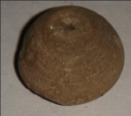 | Description / विवरण | Small terracotta bead with betel nut body and flat base. It has perforated hole in centre and surrounded with striation marks. It is semi fine and has a depression at base. The body and base is slightly chipped off. |