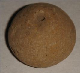 | Description / विवरण | Small terracotta bead with betel nut body and flat base. It has perforated hole in centre and surrounded with striation marks. It is semi fine and has a depression at base. |