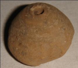 | Description / विवरण | Small terracotta bead with betel nut body and flat base. It has perforated hole in centre and surrounded with striation marks. It is semi fine and has a depression at base. The base and lower body at one side is slightly mostly chipped off. |