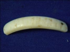 | Description / विवरण | Fragment of an ivory bangle. The outer rim has incised line design on it. One side has piercing nail. The inner rim has slanting edge. |
