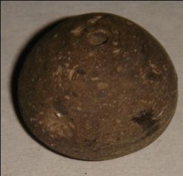 | Description / विवरण | Small terracotta bead with betel nut body and flat base. It has perforated hole in centre and surrounded with striation marks. It is semi fine and has a depression at base. |