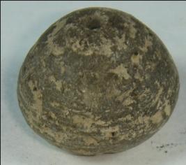 | Description / विवरण | Small terracotta bead with betel nut body and slightly oval base. It has perforated hole in centre and surrounded with striation marks. It is semi fine and has a depression at base. |