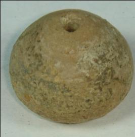 | Description / विवरण | Small terracotta bead with betel nut body and oval base. It has perforated hole in centre and surrounded with striation marks. It is semi fine and has a depression at base. |