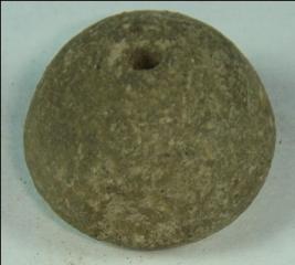 | Description / विवरण | Small terracotta bead with betel nut body and flat base. It has perforated hole in centre and surrounded with striation marks. It is semi fine and has a depression at base. |