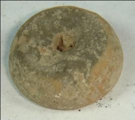 | Description / विवरण | Plain, cylindrical terracotta bead with a perforated hole at the centre. It is slightly tapering at the top and has flat ends. Upper part is slightly chipped off at two places. |
