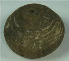 | Description / विवरण | Small terracotta bead with betel nut body and flat base. It has perforated hole in centre and surrounded with striation marks. It is semi fine and has a depression at base. It is hand made and crudely finished. The body is slightly weathered off. |