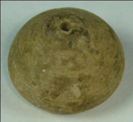 | Description / विवरण | Small terracotta bead with betel nut body and oval base. It has perforated hole in centre and surrounded with striation marks. It is semi fine and has a depression at base. |