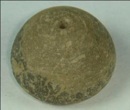 | Description / विवरण | Small terracotta bead with betel nut body and oval base. It has perforated hole in centre and surrounded with striation marks. It is semi fine and has a depression at base. |