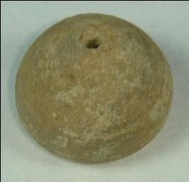 | Description / विवरण | Small terracotta bead with betel nut body and flat base. It has perforated hole in centre and surrounded with striation marks. It is semi fine and has a depression at base. |