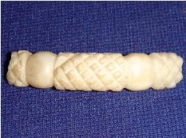 | Description / विवरण | Small fragment of a bangle, made of shell, in white colour. It has block design in the centre and at both ends. In centre two plain and polished cylindrical designs are made. |