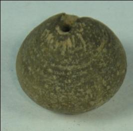 | Description / विवरण | Simple, perforated terracotta bead, betel nut in shape with tapering flat base. The upper part has mild concentric circles and the base has depression. |