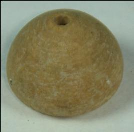 | Description / विवरण | Simple, perforated terracotta bead, biconvex in shape with oval base. It has close striation marks and a depression near hole at lower end. |