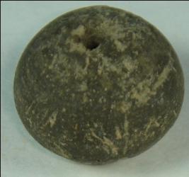 | Description / विवरण | Small terracotta bead with betel nut body and slightly oval base. It has perforated hole in centre and surrounded with striation marks. It is semi fine and has a depression at base. The body is slightly weathered off. |
